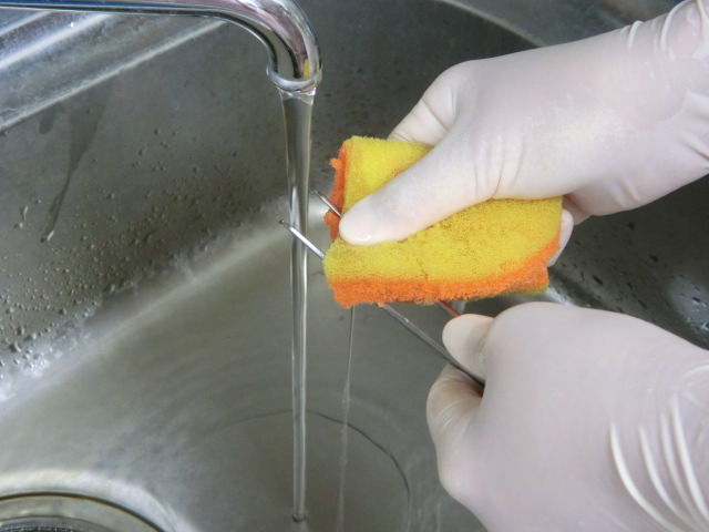 流水下で洗浄し、汚れを取り除きます。